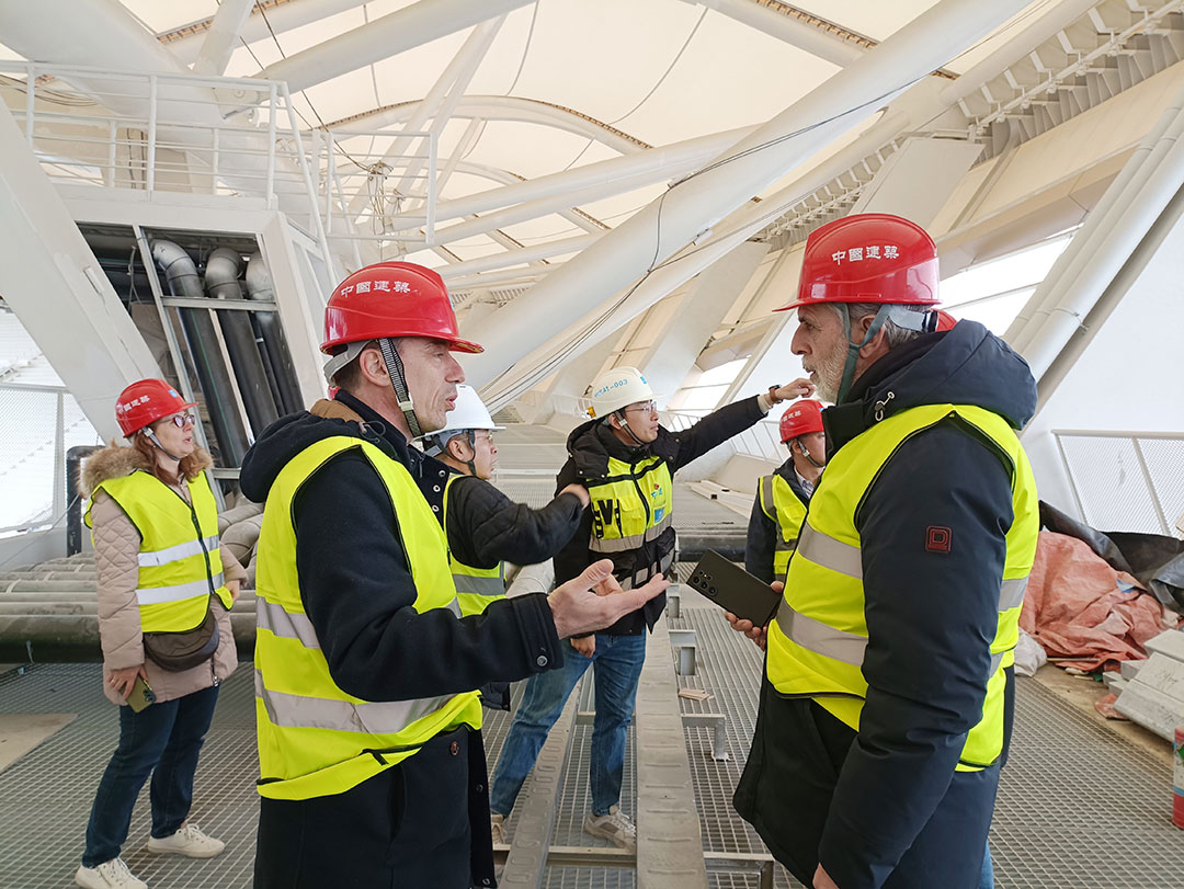 膜結構生產基地內,ETFE、PTFE等高性能膜材的裁剪、熱合工藝有序推進,技術人員現場講解演示了膜材的生產加工過程,以及各類生產過程中的細節處理。鋼結構生產車間,激光切割設備的精準作業,等離子數控車床的高效運轉,笨重的鋼板經切割、折彎、拋丸等一系列精密工序,化身為兼具力量與美感的異形構件,整個參觀過程讓外國友人直觀感受中國鋼膜結構制造的精細化水平。
